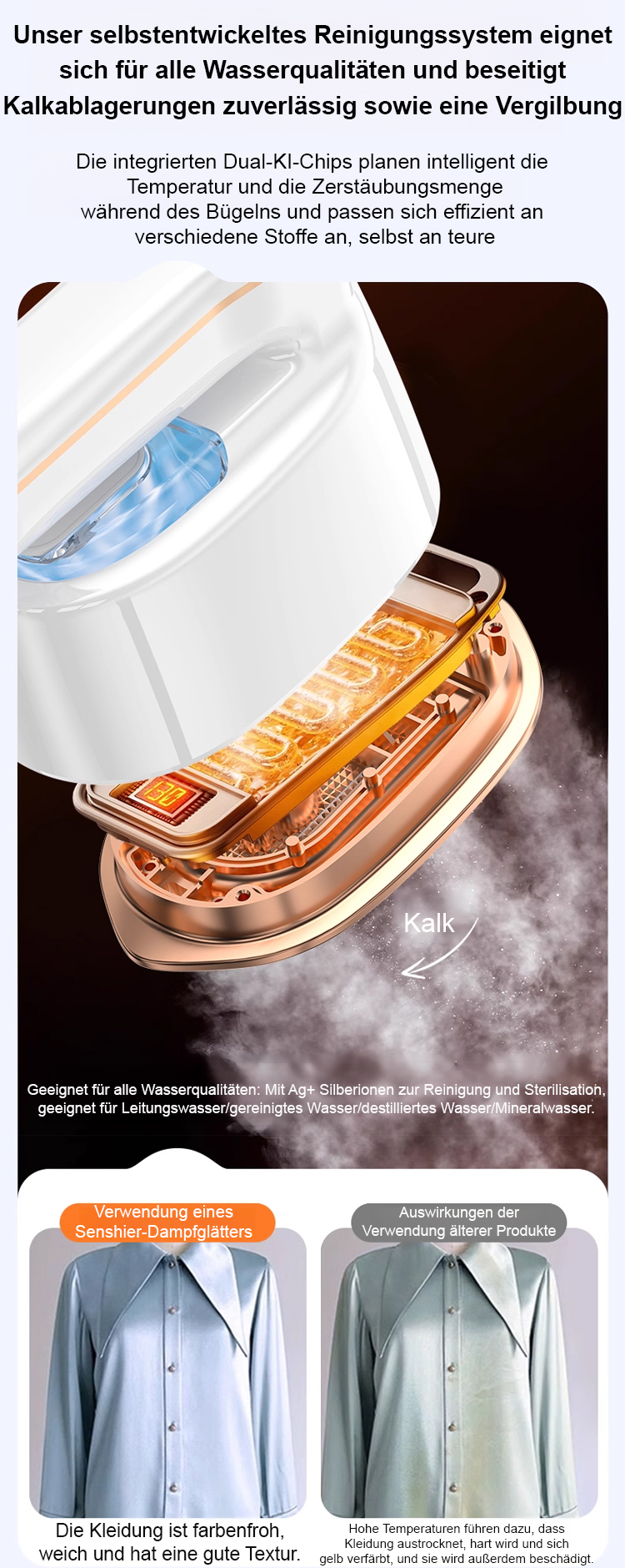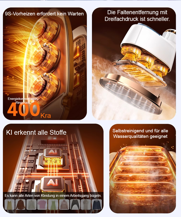 Dank innovativer Mikro-Dampf-Technologie und Keramik-Panel glätten Sie Ihre Kleidung in Sekunden. Ob Seide, Anzug oder dicke Wolle – der Chip wählt die perfekte Temperatur, ohne Wasserflecken oder Beschädigungen. Sofort anziehen!